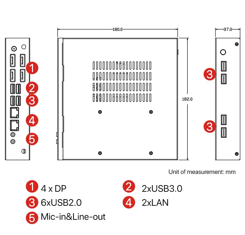 • Rich I/O Ports: 4xDP, 2xUSB3.0, 6xUSB2.0, 2xLAN, Mic-in, Line-out