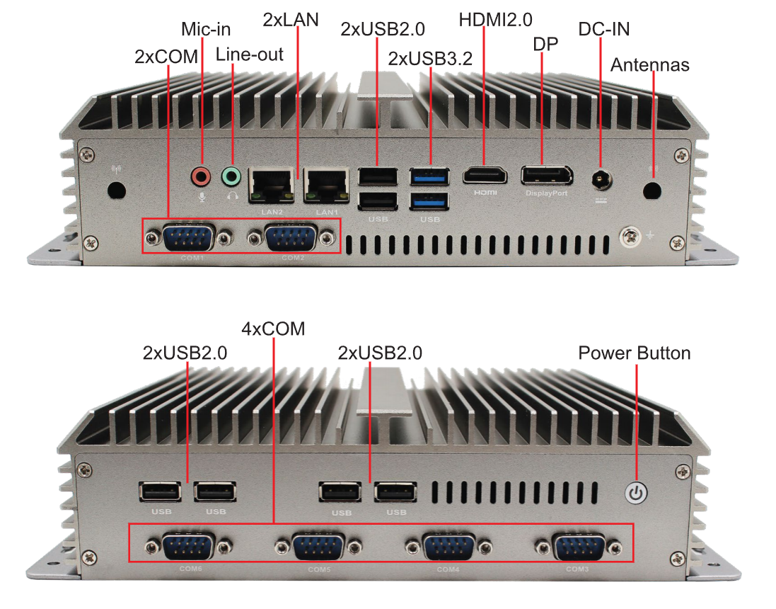 I/O Ports: 2xUSB3.2, 6xUSB2.0. 2xLAN, 6xCOM
