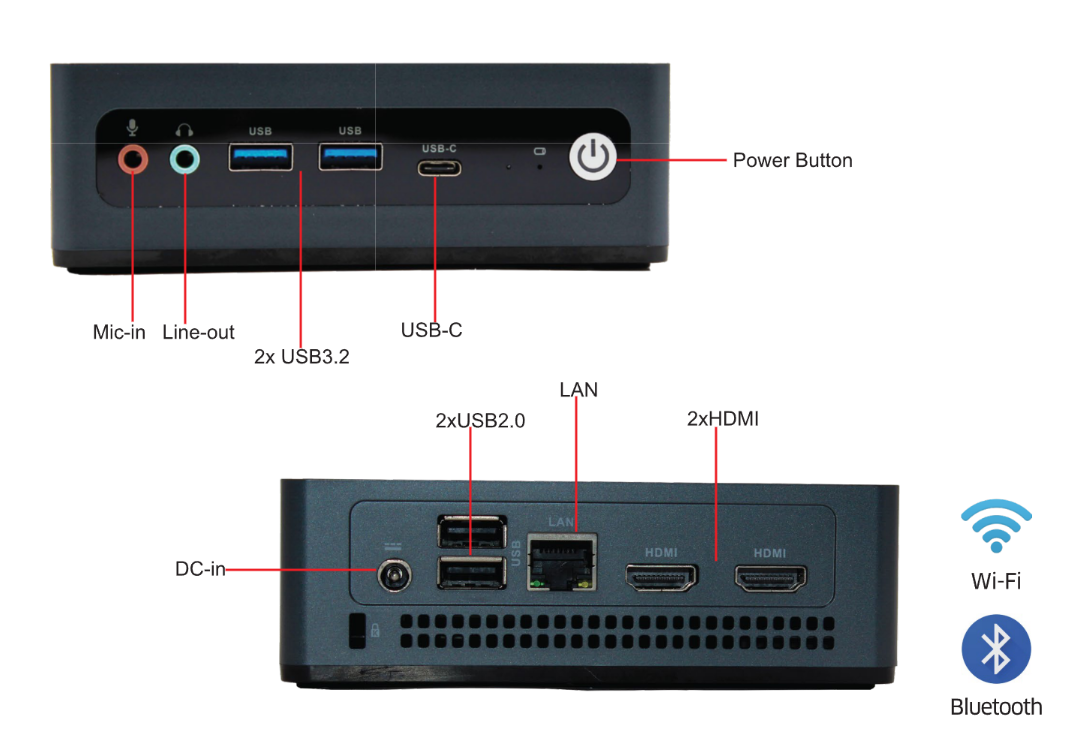 I/O Ports: 2xUSB3.2, 2xUSB2.0, 1xLAN, 2xHDMI, USB-C, Line-out, Mic-in