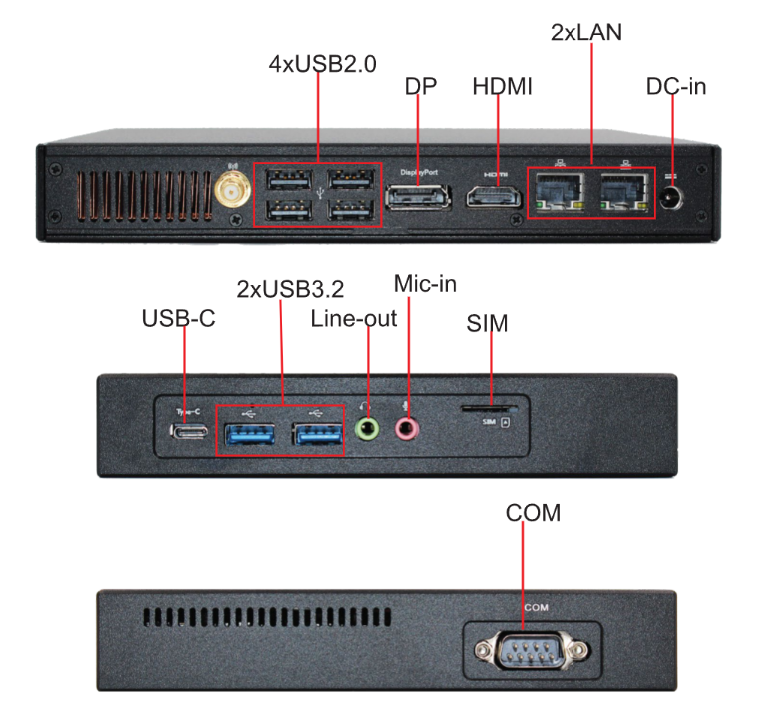 I/O Ports: 2xLAN, 1xCOM, 2xUSB3.2, 4xUSB2.0, USB-C